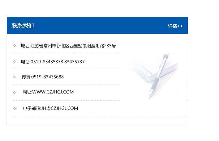 傳真:0519-83435688    郵編:213135    網址:WWW.czjhgj_com.de-tron.com    電子郵箱:JH@czjhgj_com.de-tron.com